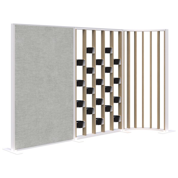 This stylish Connect Freestanding Fabric/Plant Wall/Curved Fin Room Divider is ideal for creating individual zones without building permanent walls within the office, work, or school environment. The modern room divider allows partial visibility and light transfer, while the fabric screen creates a semi-private area ideal for holding meetings with minimised disruption to others within open plan workplaces. Using live plants (not included) in the divider wall can introduce calming greenery to an area. The dividing screen also helps absorb background noise.