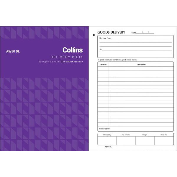 Collins goods delivery books are essential for recording delivery details and signatures for proof of delivery. Books have a purple cover and six figure numbering.