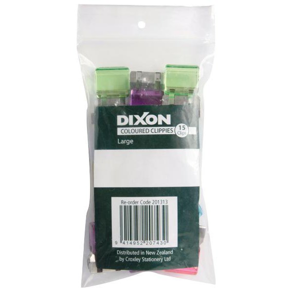 Clip large amounts of paper together with firm grip with these Dixon Coloured Clippies paper clips. This unique system clips thick documents with ease and the clips leave no staple marks, and no dispenser is required. Clips can be recycled and used again and again so they are great value for money. Each large clip holds up to 50 sheets of paper and they come in a pack of 15 clips.
