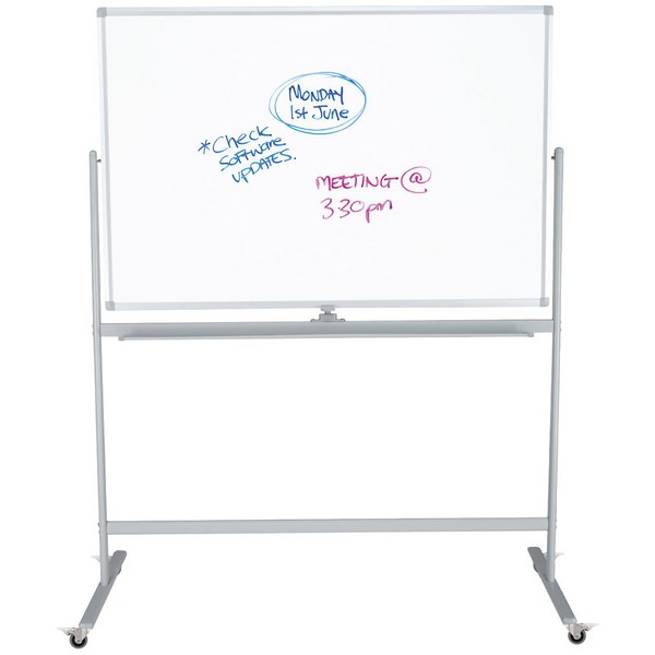 The Boyd Visuals Pivoting Mobile Whiteboard has an acrylic surface with magnetic capabilities ideal for presentations and meetings. It pivots 360 degrees and is double sided with a dark grey frame and pen shelf made from aluminium. The board frame is on 50mm castors can be locked into place easy of moving and stability. The base of the board has wheels for easy transportation and board angle can be adjusted.