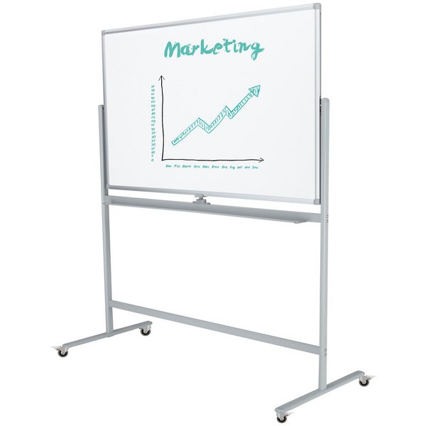 The Boyd Visuals Pivoting Mobile Whiteboard has a porcelain surface with magnetic capabilities ideal for presentations and meetings. It pivots 360 degrees and is double sided with a dark grey frame and pen shelf made from aluminium. The angle of the board can be adjusted and the base of the frame features 50mm castors that can be locked into place for stability or released for easy moving.