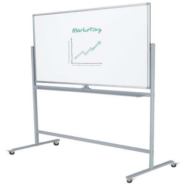The Boyd Visuals Pivoting Mobile Whiteboard has a porcelain surface with magnetic capabilities ideal for presentations and meetings. It pivots 360 degrees and is double sided with a dark grey frame and pen shelf made from aluminium. The angle of the board can be adjusted and the base of the frame features 50mm castors that can be locked into place for stability or released for easy moving.