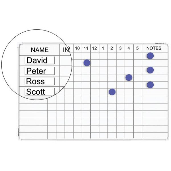 The Boyd Visuals staff indicator magnetic whiteboard is ideal for monitoring staff whereabouts as well as keeping everyone informed of staff whereabouts. It measures 450x600mm and includes magnets a pen shelf and features a modern aluminium frame with concealed wall fixings.