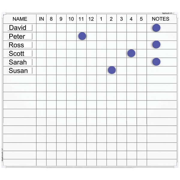 The Boyd Visuals staff indicator magnetic whiteboard is ideal for monitoring staff whereabouts as well as keeping everyone informed of staff whereabouts. It measures 600x600mm and includes magnets a pen shelf and features a modern aluminium frame with concealed wall fixings.