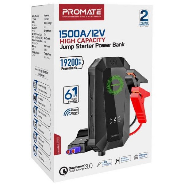 The Promate 19000mAh Jump Starter Power Bank is a versatile powerhouse designed to keep you prepared for different road situations. With a peak current of 1500A at 12V, the power bank is powerful enough to jump start your car or motorcycle, whilst its smart clamps feature ensures protection from current overflow and short circuits. The power bank allows simultaneous charging of two devices via its dual port, and offers wireless charging capability.