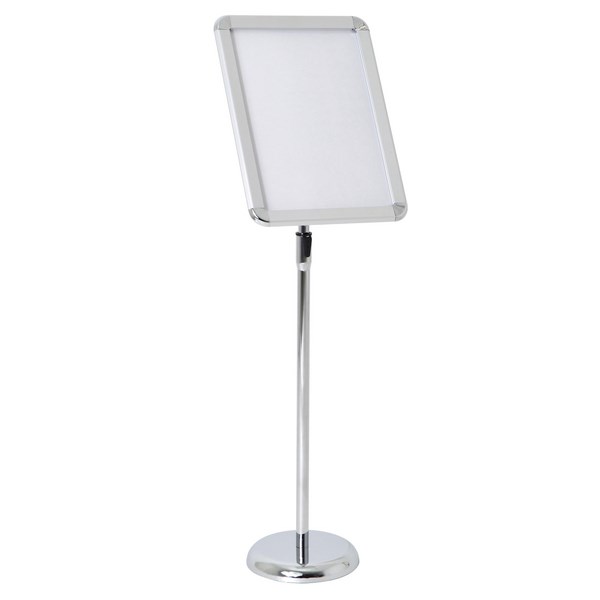 The elegant simplicity of a snap lock poster frame mounted onto an adjustable height chrome pole and base. Ideal for reception areas, foyers and showrooms. Can be used in both landscape and portrait style.