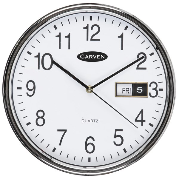 The Carven Analogue Wall Clock is a metallic silver framed wall clock, a perfect addition to your wall at home, in the office or in the classroom. The Carven Analogue Wall Clock has clear numbers displayed around the clock which has a diameter of 285mm. It also features an analogue day & date display that is 55mm in length and 18mm in height. The clock uses 1x AA battery (not included) and has a glass screen.
