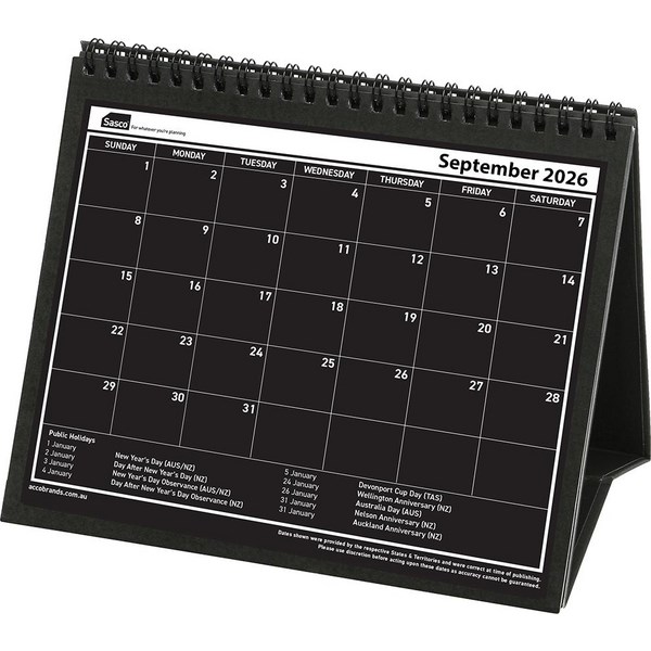 This Sasco Desk Tent Calendar will be a stylish addition to your home or office. It features a 1 month per page design on thick card, with 2 colour options, black or white. Comes in a tent style, which allows you to stand it upright by itself on any flat surface such as a desk or bench top. Has a spiral bound spine allowing you to flip the pages over easily and public holidays listed.
