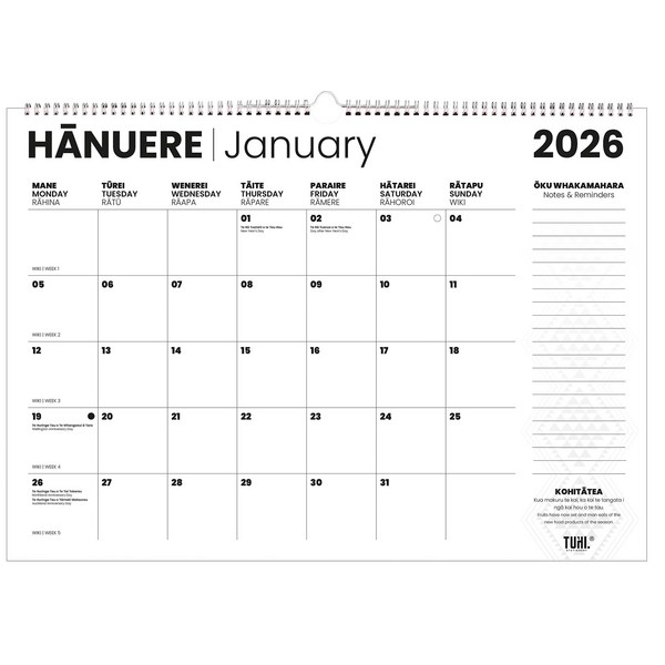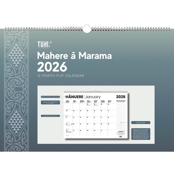 The Tuhi Bilingual English/Maori Wall Calendar is a great way to keep track of your important dates and events. It features a large square grid layout with plenty of space for writing notes and noting down appointments. With a month to view layout, this calendar is ideal for viewing and planning your entire month at a glance. Featuring the traditional Maramataka with information on moon phases, planting, fishing, harvesting and gathering activities for all iwi communities, this calendar will allow you to embrace Maori language and culture every day.