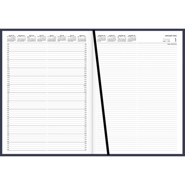 This Collins A41 Appointment Diary has a two pages per day layout. This layout is ideal for the serious planner as it provides maximum space for planning and detail. The left hand page features appointment time slots so you can keep track of meetings and events, while the right hand page is blank with ruled lines and is entirely dedicated to note taking, reminders and memos.