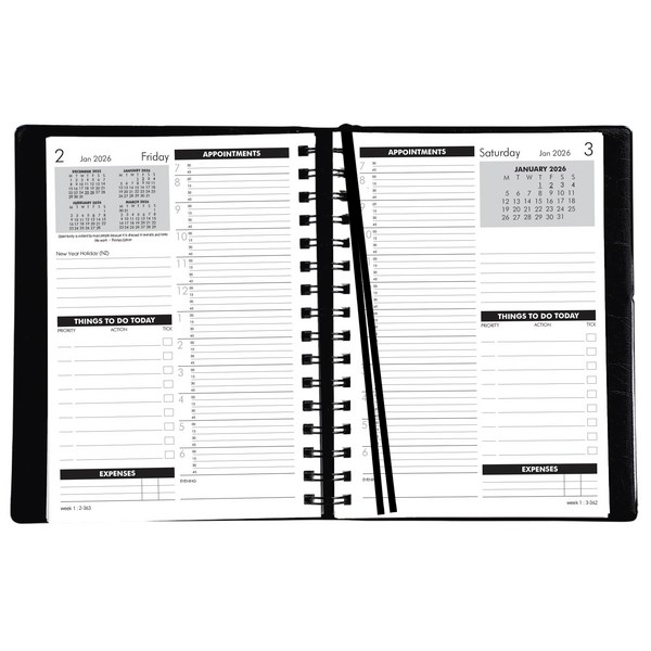 This Collins MDA51A Time Manager Diary is perfect for those who need to organise their day and keep track of their busy schedule. The diary has a day per page layout with space for appointments and brief notes. There is also a daily 'To Do' list and expense tracker on each page. With its compact size and firm padded PVC slip case cover, this diary will make organising super easy.
