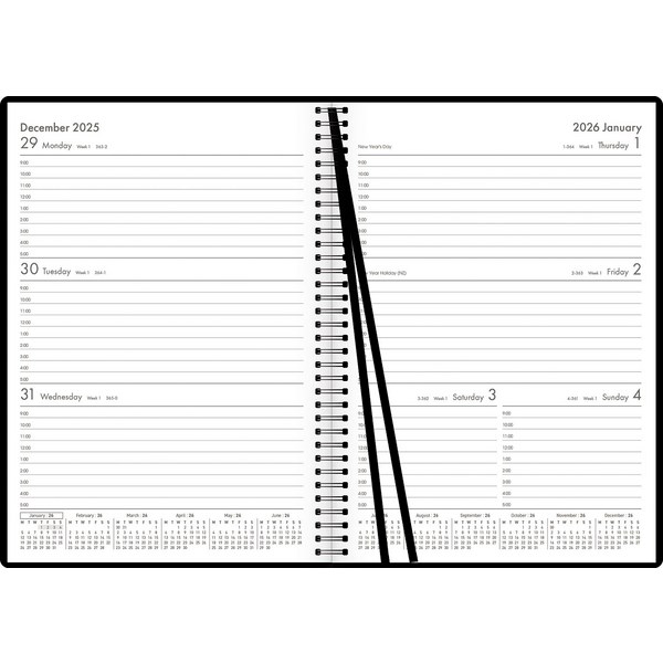 The OfficeMax A53 Executive Wiro Diary is a stylish choice for business professionals who need to keep track of their important information and appointments. It has a week to view layout with ruled space for noting tasks and appointments. This layout is ideal for those who plan and organise across an entire week and need to see their schedule at a glance. The diary has a durable PVC cover and internal wiro binding that enables it to lay flat on the desk when open.