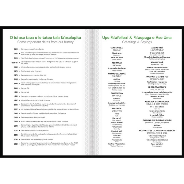 This Tuhi B51 Bilingual O Aso Ma Ona Fuafuaga Diary is an ideal way to keep track of appointments and help you stay organised. It has a day per page layout with plenty of space for notes, meetings and tasks. This layout is perfect for those who need to plan out each day in full with plenty of detail. The diary has space for weekly reflections and goal setting and contains plenty of Samoan content to help bring Samoan language and culture into your everyday life and into your workspace. The diary includes Samoan history, significant dates, prayers, songs, greetings, sayings and proverbs.