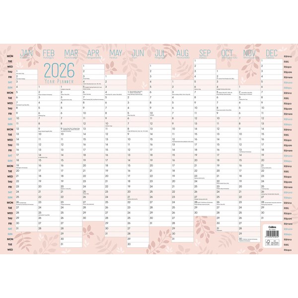 This Collins Designer Wall Planner offers a year to view format that is ideal for those who need to see and plan their entire year at a glance. The wall planner is double sided and has two different layouts. One side has months along the top and days down the side and the other has days along the top and months down the side. This double-sided format lets you pick the format that works best for your planning and organising needs. It also features bilingual content in both English and Te Reo Maori.