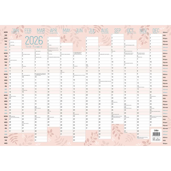 This Collins Designer Wall Planner offers a year to view format that is ideal for those who need to see and plan their entire year at a glance. The wall planner is double sided and has two different layouts. One side has months along the top and days down the side and the other has days along the top and months down the side. This double-sided format lets you pick the format that works best for your planning and organising needs. It also features bilingual content in both English and Te Reo Maori.