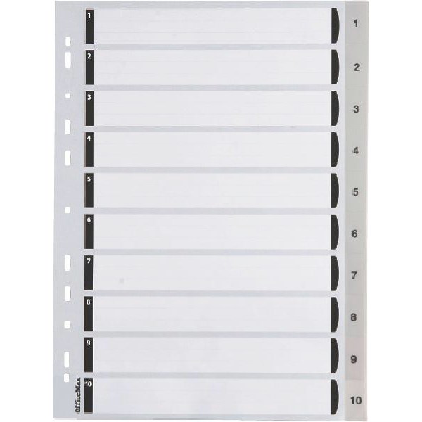 OfficeMax Index Dividers are 1-10 printed tabs to help you organise your important documents such as invoices into different sections. It is also ideal for documents that need to be accessed on a regular basis, as the strong polypropylene maintains the dividers high quality and appearance. It includes a table of contents so you can organise all your tabs and access them with ease.