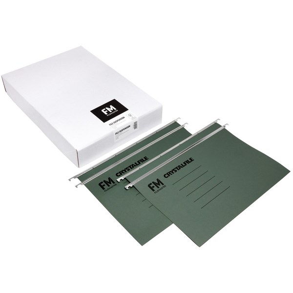 These heavy duty FM Suspension Files have a double capacity ideal for storing thick and bulky documents. They feature quality moulded nylon glides to allow the file to slide with ease in vertical cabinets. Each file has as 43mm gusset with a reinforcing cardboard brace for added strength.