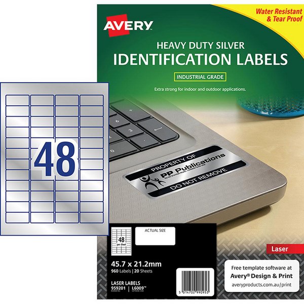 These Avery Heavy Duty Laser ID Labels are designed for asset tagging and identification, perfect for use on electronics, office equipment, tools, medical supplies and refrigerated samples and containers. The identification labels are tear-proof and resistant to oil, water, dirt and UV. Built to withstand temperatures from -20°C to +100°C, these durable labels are compatible with black and white laser printers for a clean, professional finish.