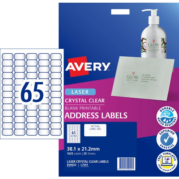 These Avery Crystal Clear Laser Address Labels are great for letters, mail-outs and invitations. The glossy clear labels are premium quality and completely transparent, ideal for use on coloured paper, envelopes, for corporate events and for wedding invitations. Labels are designed for reliable printing through laser printers to minimise wastage and to save time. To create and customise convenient, professional labels simply download and use the free Avery Design and Print template software.