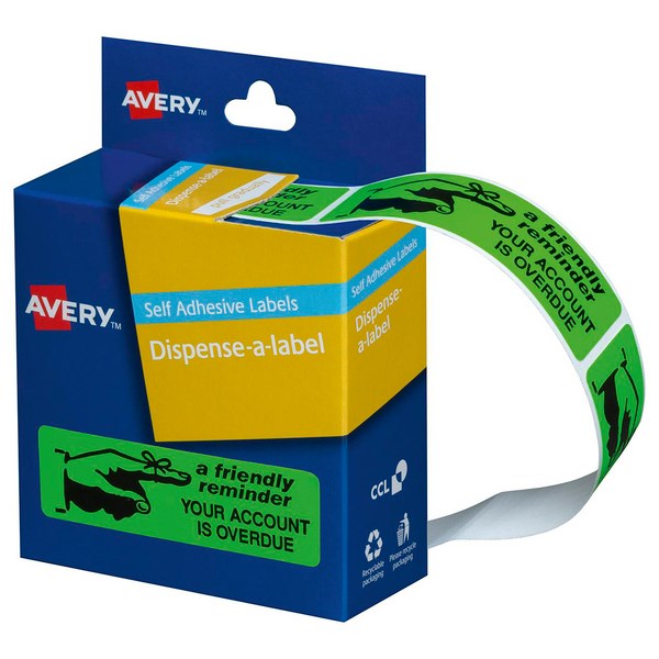 These Avery Dispenser Labels with 'Friendly Reminder' printed on them are ideal for highlighting and labelling accounts that are overdue. The fluorescent green labels have removable adhesive, allowing you to re-position and replace when needed. The Friendly Reminder labels come in a handy dispenser box which causes labels to pop up easily when pulled, ideal for repetitive or routine tasks. Labels measure 64x19mm.