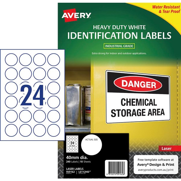 The Avery Heavy Duty Identification Laser Labels are tough and resist oil, dirt and water making them the perfect choice for situations where a standard label won't meet the purpose. These tear-proof labels are ideal for using on assets such as machinery and equipment. Download and use the free Avery Design and Print template software to easily create and customise labels. Labels are designed for laser printers and are not affected by temperature variations between -20 to +80 degrees Celsius. The perfect solution for customising work-site hard hats, safety signs and organising storage.