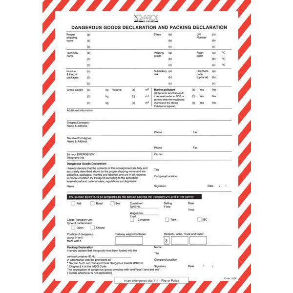 Dangerous Goods Declaration Form, Pad of 50