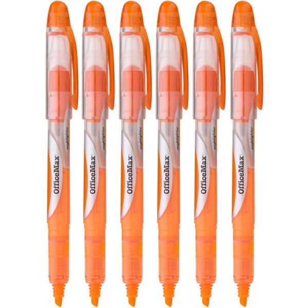 Make your text stand out with these liquid ink pen style highlighters from OfficeMax. They are non-toxic and have long-lasting orange ink, which is perfect for use at home, work or study. It comes in a pack of 6 orange highlighters that have a chisel tip producing a line width of 3.0mm. The pen style design makes it easy to hold and mark your important information.