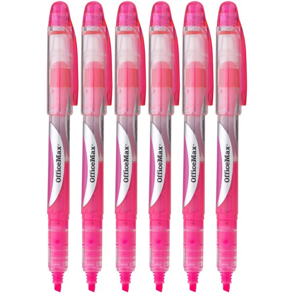Make your text stand out with these liquid ink pen style highlighters from OfficeMax. They are non-toxic and have long-lasting pink ink, which is perfect for use at home, work or study. It comes in a pack of 6 pink highlighters that have a chisel tip producing a line width of 3.0mm. The pen style design makes it easy to hold and mark your important information.