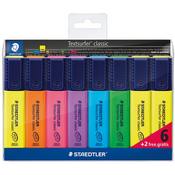 Highlight important information on documents and spreadsheets with Staedtler's Textsurfer Classic Highlighters. The markers are long-lasting and fast drying and have twist caps for easy opening. They perform perfectly on inkjet print-outs without smudging and with the highlights still remaining visible after photocopying. These highlighters feature a poly prop barrel and cap, and are airplane-safe, preventing the marker from leaking on board the aircraft.