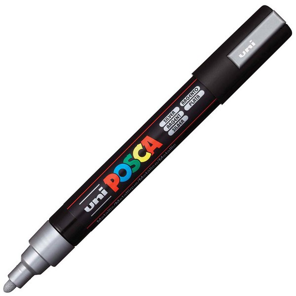This medium bullet silver uni POSCA Paint Marker is a versatile writing instrument that writes permanently on porous surfaces, doesn't bleed through paper and wipes off glass. It has quick drying water-based pigment ink that produces a bright dense colour on many surfaces. Great for writing on windows and plastic for a temporary message or permanently on paper or wood.