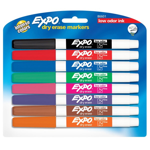 These Expo Dry Erase Markers with Fine Tip feature non-toxic and low odour ink. The dry erase markers are perfect for classrooms, meeting rooms, small offices and for use at home. The set contains eight different colours; Black, Blue, Green, Red, Pink, Purple, Orange and Brown. Present, brainstorm, track and schedule with these dry erase markers.