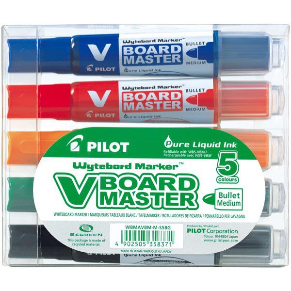 This assorted pack of 5 Pilot V Board Master Whiteboard Markers feature an ink that is light resistant and highly visible. The marker itself is made with a minimum of 70% recycled materials reclaimed from manufacturing. The Pilot V board whiteboard marker gives stable ink density and intense depth of colour till the last drop with no need for pumping or shaking.