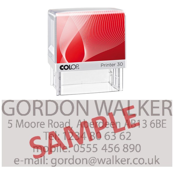 This handy Colop L30 Custom Stamp is self-inking and gives a square 47x18mm imprint, making it perfect for text or a logo. It has a built-in ink pad which gives thousands of clear imprints before it needs to be replaced. This stamp is suitable for up to 5 lines of custom text and has a variety of design options and ink colours.