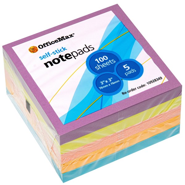 OfficeMax Self-Stick Notes 76x76mm Assorted Bright Colours 100 Sheets, Pack of 5
