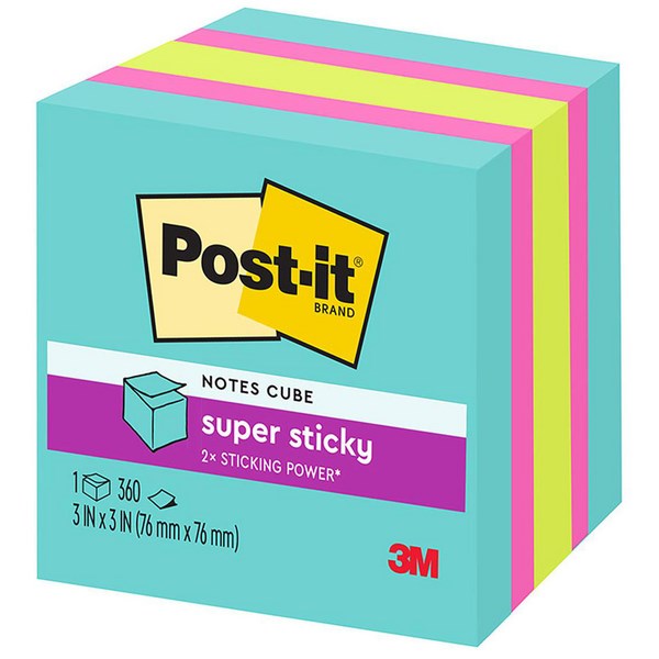 This Post-It® 2027-SSGFA Super Sticky memo pad cube is a great way to jot down notes and ideas when you're in a hurry. The fun-sized cube format has 360 sheets and measures 76x76mm. The 2027-SSGFA cube features aqua, pink and lime to ensure your notes stand out. Each sheet has a unique adhesive technology that can adhere and stick to almost any surface such as walls, doors and paper.