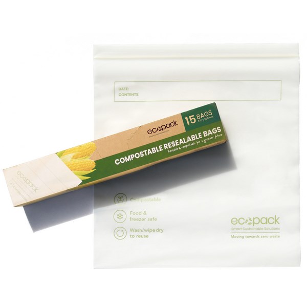 These Ecopack Compostable Resealable Storage Bags are food safe and freezer safe. They are ideal for food storage or storing loose items. The bags are certified for home and commercial composting, where the entire bag can be placed in the compost bin. The snap lock bags measure 270x300mm and come in a handy set of 2 boxes, with each box containing 15 bags.