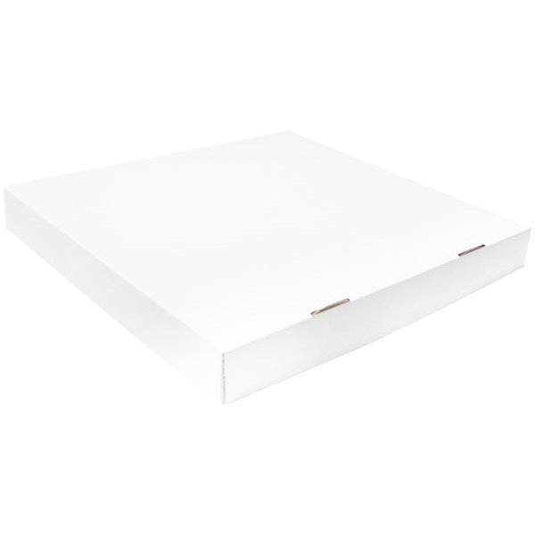 White corrugated 14" Pizza Box made from BE Flute board grade. This box has vent holes to prevent internal condensation from hot food. These boxes stack well and measure 360x360x40mm.