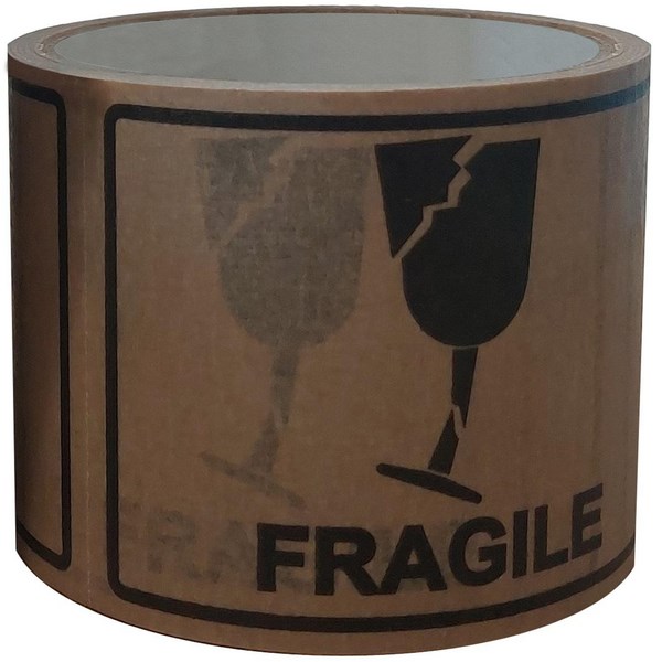 • Shipping labels printed with 'Fragile' in black on a brown background