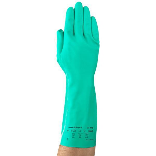 These Solvex 37-175 flock lined nitrile gloves are designed to provide maximum chemical and abrasion resistance. The gloves are 330mm long with a textured palm grip. They are thick enough to provide good chemical protection without sacrificing touch/feel sensitivity. Recommended for use in food processing, industrial cleaning, metal fabrication, surface coating, solvent & acid application as well as petrochemical, aerospace and automotive industries.