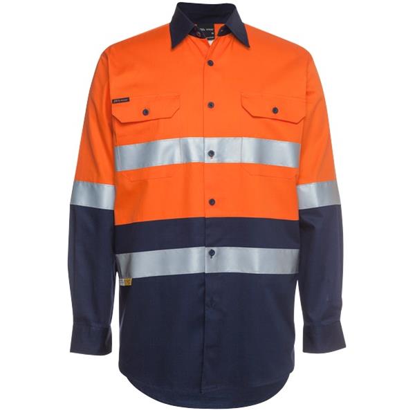 This JB's Wear Hi Vis Long Sleeve Shirt in Orange/Navy is excellent for every day work wear. Made from 190gsm pre-shrunk pure cotton drill the long sleeved shirt features reflective tape suitable for day and night use. For additional strength all pressure points are bar tacked for a durable work garment. The shirt has two pockets on the front with button down flaps to keep contents secure. Shirt has a curved hem and back tail. Great for warehousing, logistics, construction, manufacturing and more.