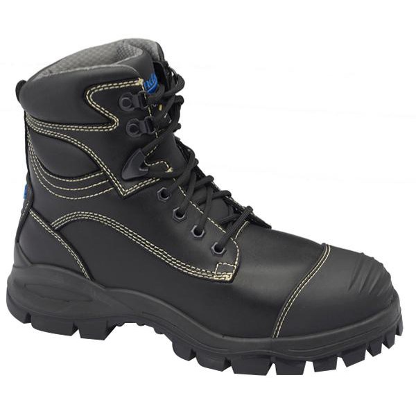 Blundstone 994 Safety Boots are made from Platinum quality black leather. They have a 150mm ankle height and a built-in Poron XRD metatarsal guard ensuring your toes are protected. The lace up system has 7 eyelets and a lack locking device. They feature water resistant uppers, moulded TPU toe guards, padded tongues and collars, thermal regulating bamboo lining, slip resistant rubber outsole, full kevlar external stitching and low density shock absorbing polyurethane midsoles.