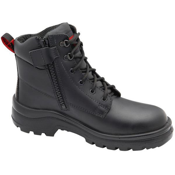 These lace-up Elkhorn Safety Boots from John Bull are equipped with a convenient side zip to save you lacing/unlacing time. An excellent boot for tradies, electricians, emergency service workers as well as security and transport workers, these general-purpose safety boots feature a dual-density polyurethane sole with 5mm deep tread. A fully cupped replaceable EVA footbed and padded collar and tongue offer superb comfort while a broad fitting 200 Joule impact resistant Type-1 steel toe cap provides excellent safety.