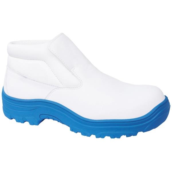 •Soft collar slip on safety boots in white with blue outsoles