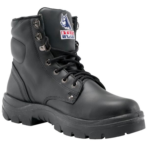 Steel Blue Argyle Safety Boots are men's derby style ankle boots that lace up. They feature a leather construction with a padded collar and tongue for extra comfort. They have a 200 joule steel toe cap and a TPU outsole which is resistant to most chemicals and oils. The leather is water resistant, heat resistant up to 130 degrees and has anti-static properties.