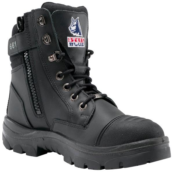 These Steel Blue Southern Cross Safety Boots come with a zip and a Hook & Loop tab to stop zip rattle. The 200J steel toe cap and anti-static properties provide safety and protection against hazards. The TPU outsole is heat resistant to temperatures up to 130 degrees C.