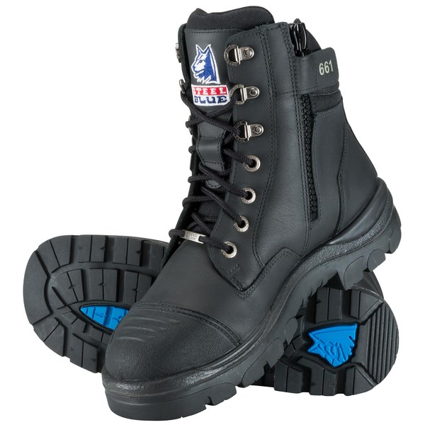 These Steel Blue Southern Cross Safety Boots come with a zip and a Hook & Loop tab to stop zip rattle. The 200J steel toe cap and anti-static properties provide safety and protection against hazards. The TPU outsole is heat resistant to temperatures up to 130 degrees C.