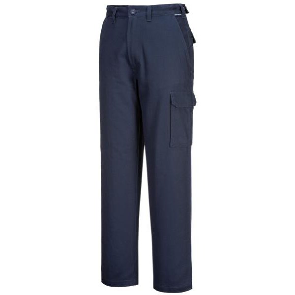 These Portwest Cargo Trousers are durable and comfortable work wear. The cargo pants are made from 100% cotton drill that is pre-shrunk. The trousers feature reinforced stress points for strength, a metal zip and metal button closure, and an adjustable waist for a comfortable fit. The trousers have two large back pockets with a touch tape closure, two deep hip pockets, a cargo pocket on the left leg and a ruler pocket to provide convenient storage.