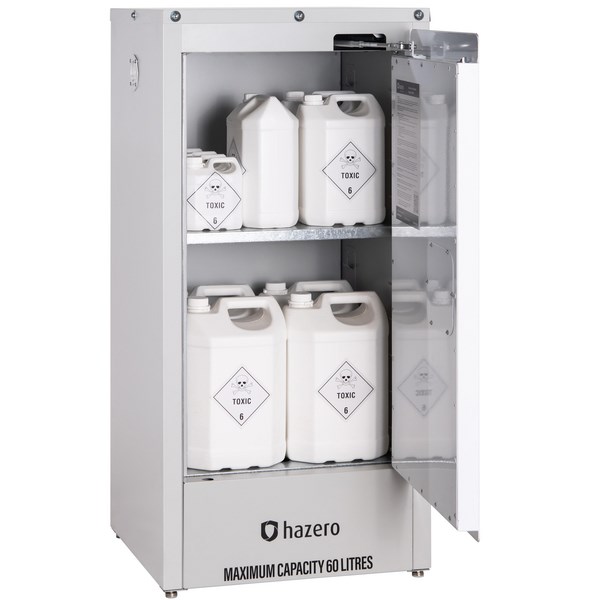 The Hazero Toxic Substance Storage Cabinet is designed to securely store Class 6 toxic and infectious substances, ensuring the safety of individuals. It is recommended to place these compact cabinets near handwashing facilities to promote safe work-hygiene practices. The cabinet features a lockable, self-closing door, an adjustable perforated shelf, and a base for efficient storage.