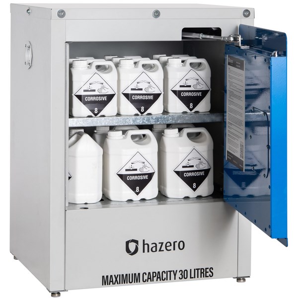 The Hazero Corrosive Liquid Storage Cabinet is designed for situations with limited space and a small number of corrosive liquid containers. It features fully bunded cabinets with two PVC spill trays to ensure safety for everyone and everything. The cabinet includes a lockable, self-closing, easy access door, a non-spark closure, and one adjustable perforated shelf, along with a base.