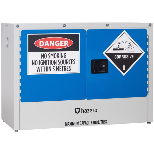The Hazero Corrosive Liquid Storage Cabinet is a compliant, compact, and robust solution designed for spaces where storage space is limited. It features two PVC spill trays to ensure safety for everyone and everything. The cabinet includes a lockable, double self-closing, easy access door, a non-spark closure, and one adjustable perforated shelf, along with a base.